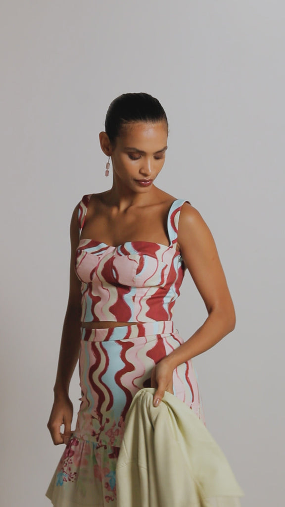 Top cropped em tecido sarja de algodão com recorte meia taça no busto. Possui zíper lateral destacável e estampa exclusiva ISOLDA inspirada nas dunas dos lençóis maranhenses.